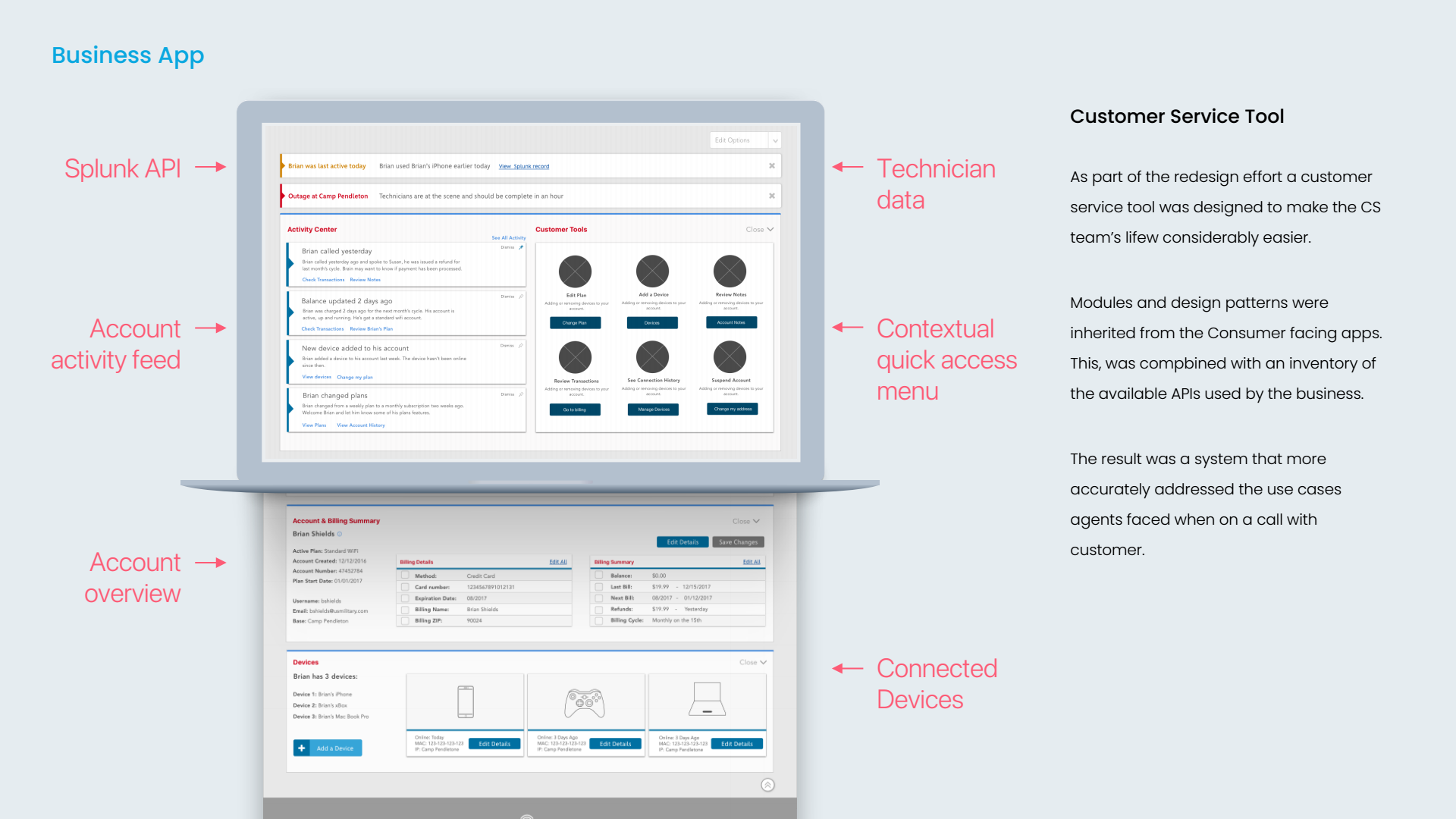 The principle architectural approach was to identify units, or modules that had functional and informational roles across user groups. As a simple example, customer care staff and users across all service lines need to know which of their devices are connected. Identifying these functional units then allowed me to map modules across account types, as well as the components we needed for MVP.