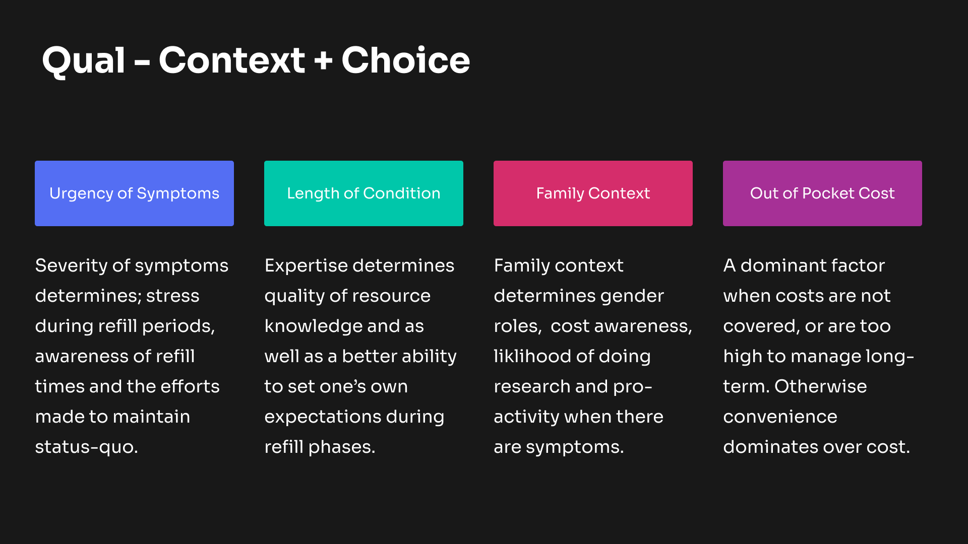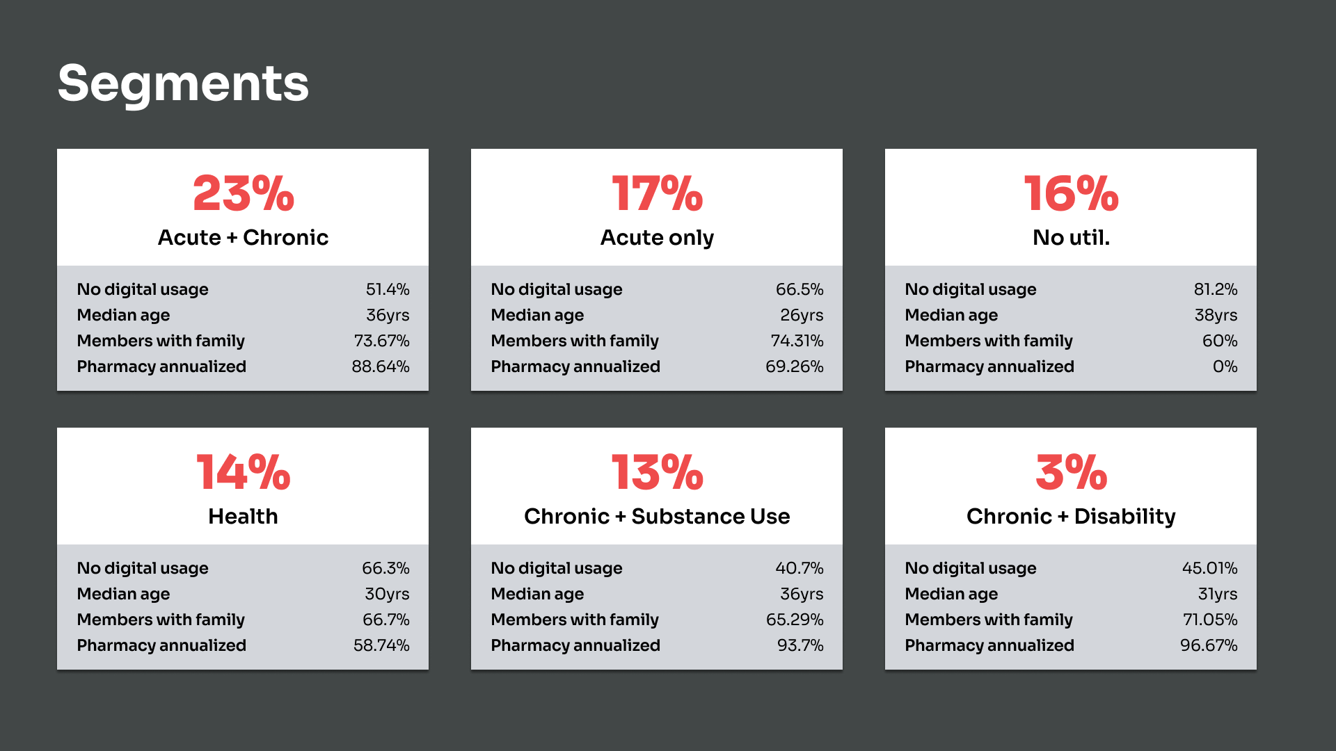 In addition, we analysed 10 years of medical data to establish unique segments. The research provided the most human-referencing design asset and helped drive understanding with respect to health and service complaints unique to segments or their families.